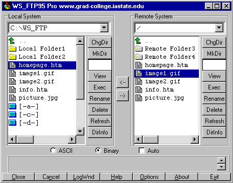 (In the above window, "homepage.htm" is the selected local file, and "image1.gif" is the selected remote file.)